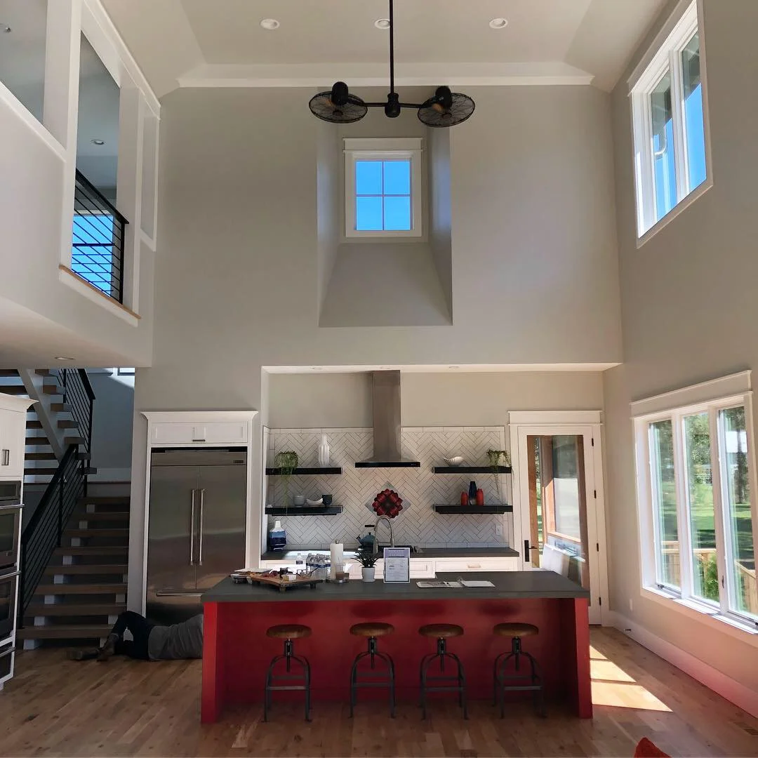 People really loved this kitchen and great room. The 21’+ tall ceilings give the space a grandiose feel when you walk through the front door. The simple and clean finished we choose throughout the house allow the space to feel welcoming despite the tall ceilings. The quarter-sawn white oak flooring was given a Bona matte finish, which compliments the matte finish of the concrete countertops we used throughout the project. The rubbed through vintage red island in the kitchen is the focal piece of the great room and adds an interesting flair to the space.